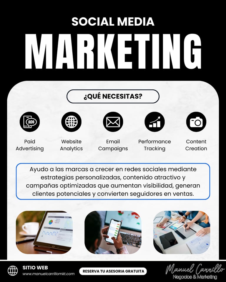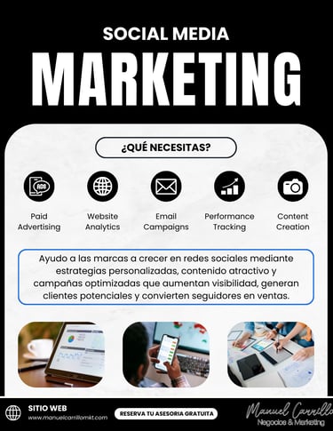 Impulsamos tu crecimiento con estrategias de marketing digital diseñadas para conectar con tu audiencia, reforzar tu marca y convertir tráfico en ventas. Combinamos análisis, creatividad y datos para lograr resultados reales y medibles en tus campañas y presencia online.